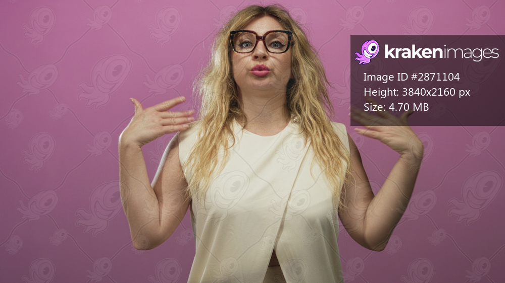 Woman with hands raised and glasses gesturing in studio with pink wall and pastel magenta backdrop; exasperation.