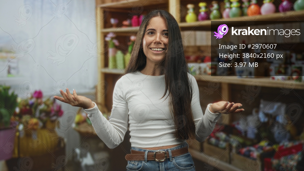Woman with hands raised in a shrug gesture inside a store building with shelves of gifts and flowers; curiosity customer interaction.