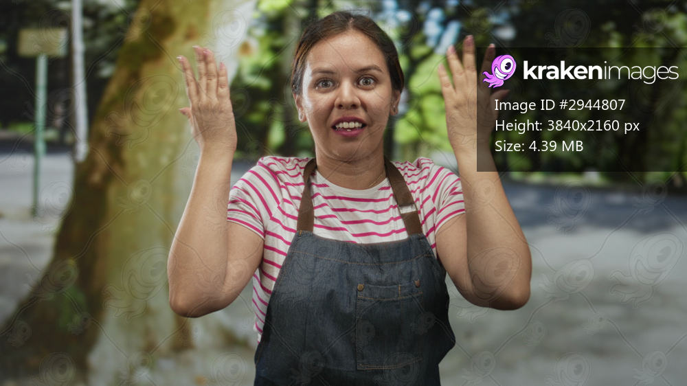 Woman with hands raised in a shrug gesture on a busy street by a large tree and red bus, wearing denim apron and striped shirt; surprise.