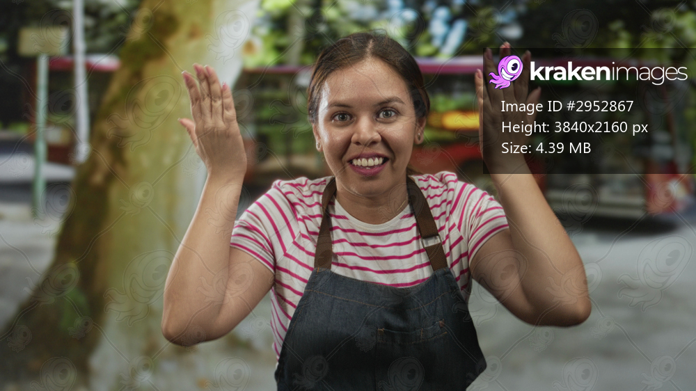 Woman with hands raised in a shrug gesture on a busy street by a large tree and red bus, wearing denim apron and striped shirt; surprise.