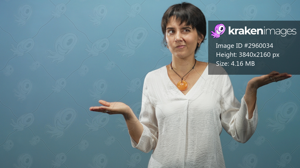 Woman with hands raised in a shrug gesture, wearing orange pendant necklace and white blouse in a studio; confusion doubt.