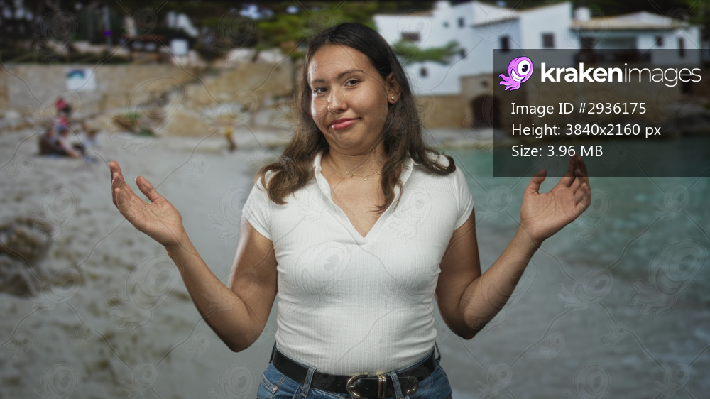 Woman with hands raised in a shrug pose in front of a coastal building by the beach, wearing white vneck and jeans; resignation acceptance.