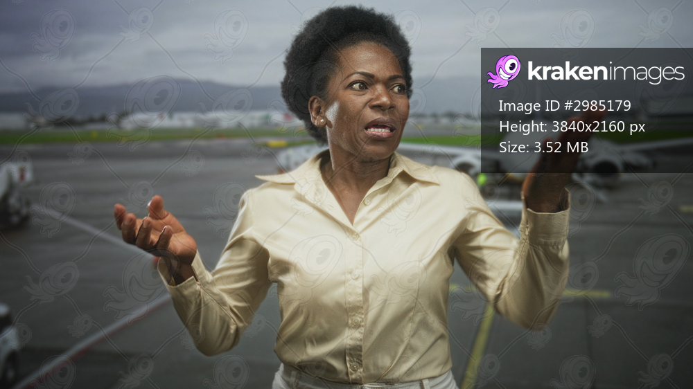 Woman with hands raised in a shrugging palm gesture beside a parked airplane at an airport gate; frustration complaint.