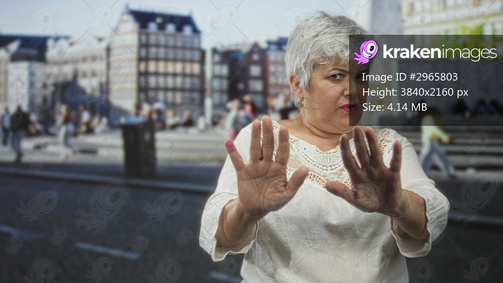 Woman with hands raised in stop gesture on street in a busy european city square, turning away from a passing bicycle rider; defensive caution.