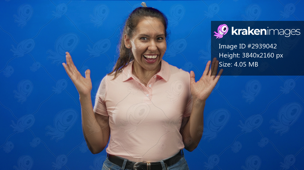 Woman with hands raised in studio in front of a blue screen wearing a pink polo; joy celebration energy.