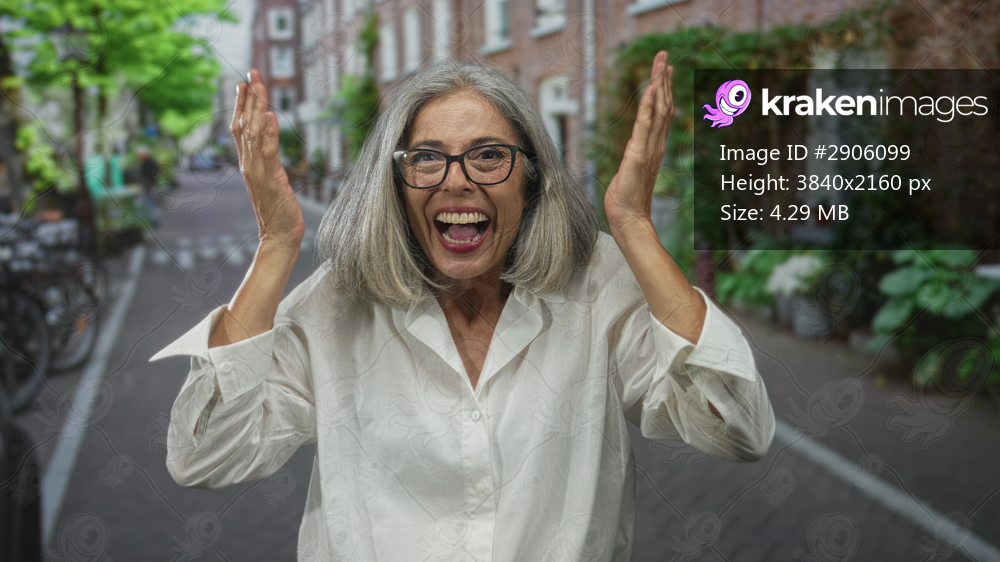 Woman with hands raised laughing on a narrow city street, wearing glasses and a white blouse, visible palms and open mouth expression; joy celebration. - Kraken Images