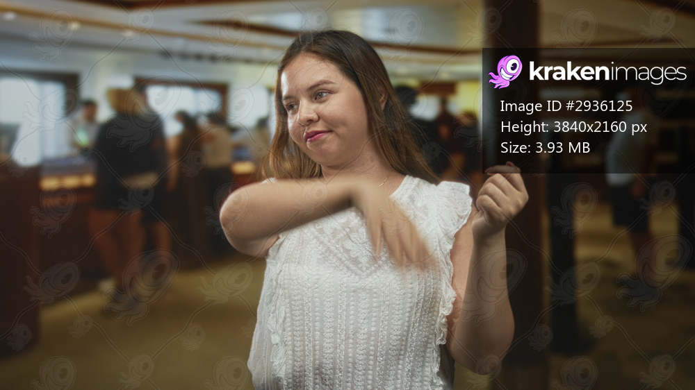 Woman with hands raised making expressive shrugging gestures in hotel building lobby among blurred guests at the desk; amusement.