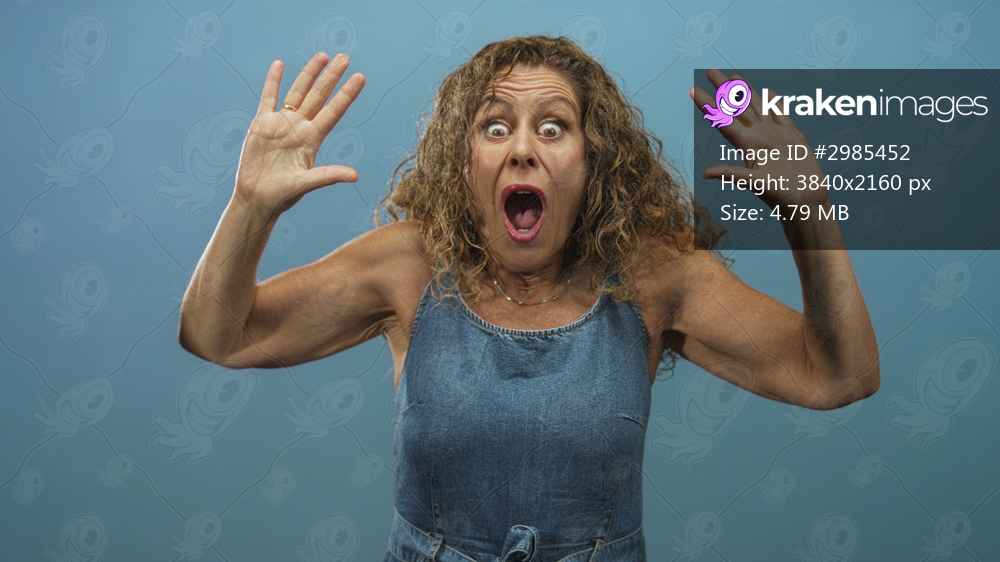 Woman with hands raised and mouth open gasping in a studio blue backdrop, denim dress visible; surprise wonder.