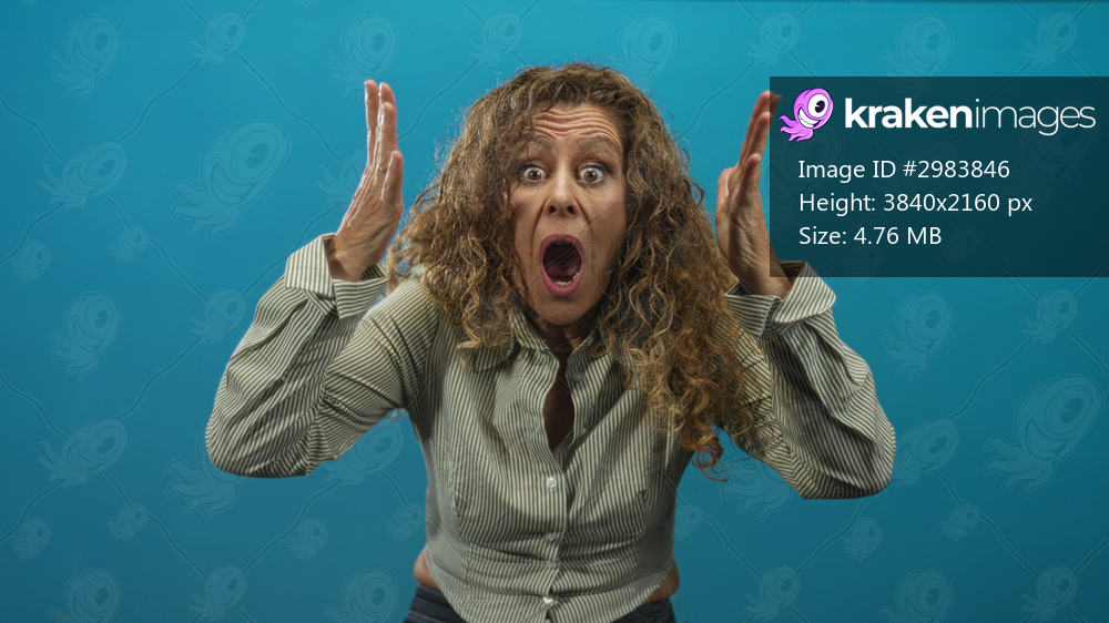 Woman with hands raised and mouth open in a studio with blue backdrop, curly hair and striped shirt showing intense surprised expression; surprise.