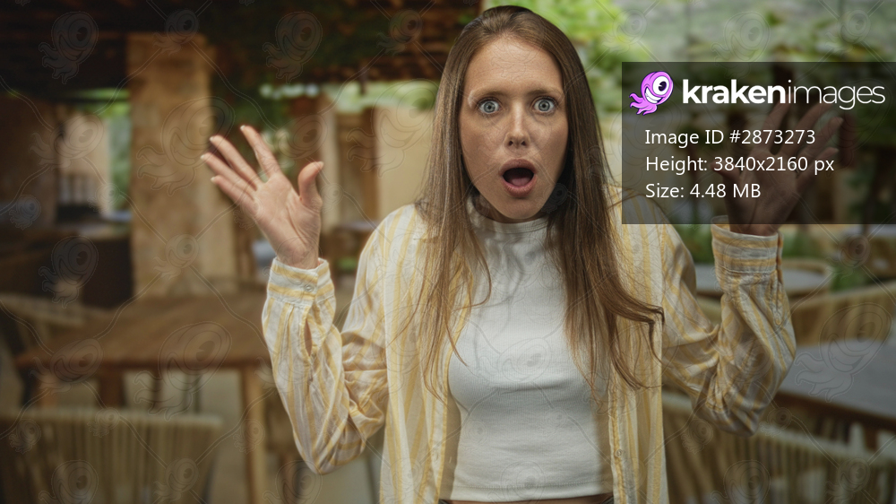 Woman with hands raised and mouth open on a restaurant terrace near the building; surprise curiosity.