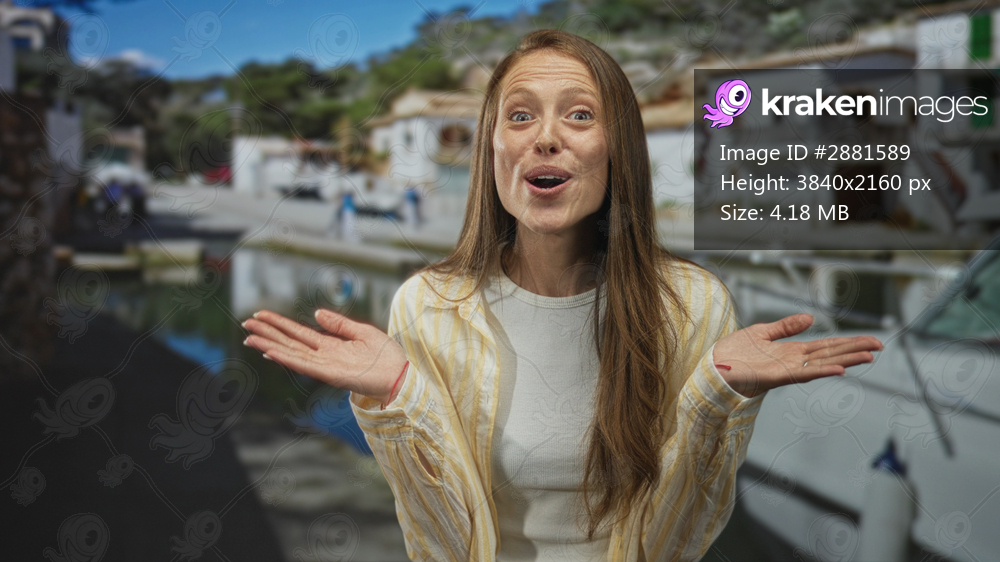 Woman with hands raised and mouth open on a street at a seaside port beside boats, facing camera with surprised expression; surprise travel.