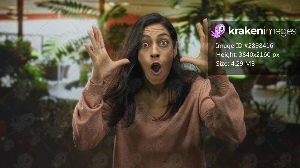 Woman with hands raised near face and mouth open, gesturing surprise in forest setting with plants and patio seating; surprise reaction.
