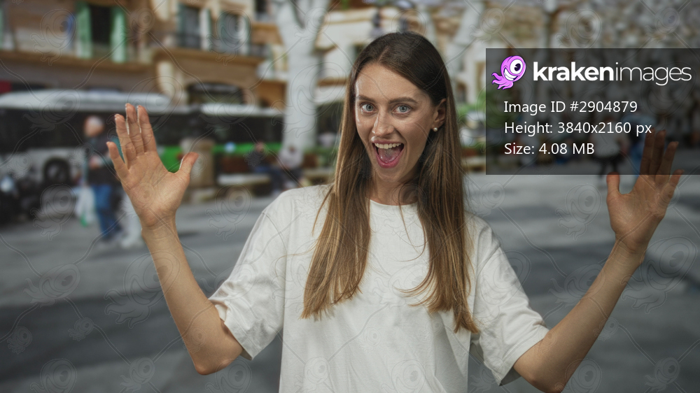 Woman with hands raised on street, palms open and smiling in a white tshirt with blurred bus and crowd behind her; joyful surprise.