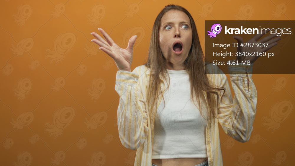 Woman with hands raised and open mouth in orange studio, touching temples and looking up; surprise reaction gesture.