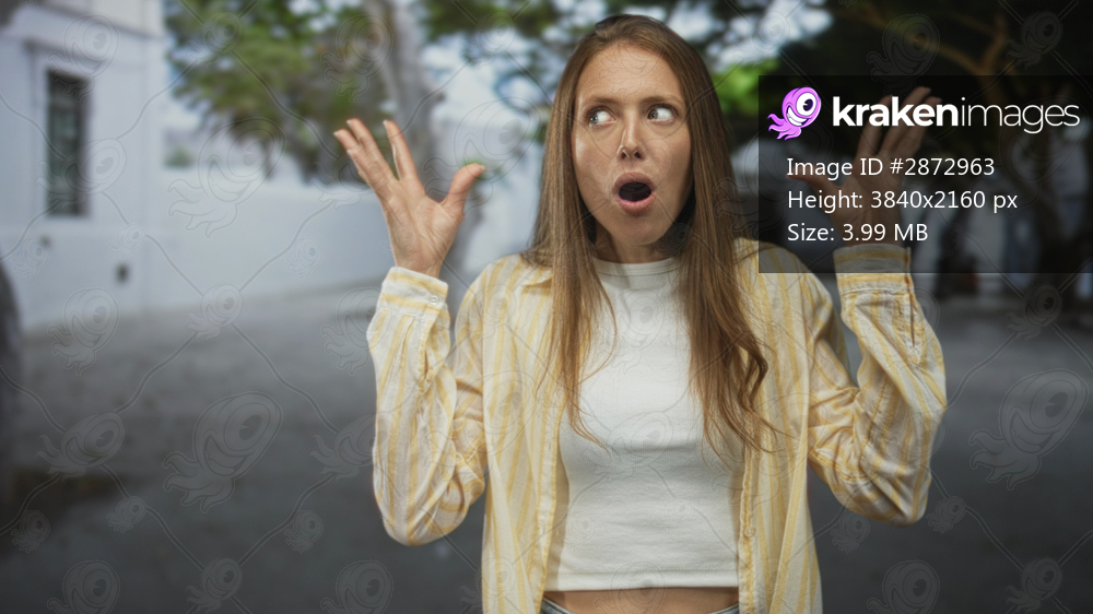 Woman with hands raised and open mouth on a tree lined street by a white building, casual shirt and crop top visible; surprise reaction.