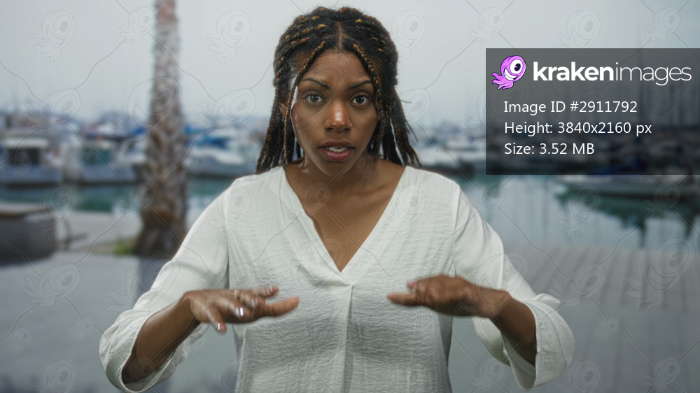 Woman hands raised palms forward at a port pier, facing camera with braided hair and white blouse; caution personal boundary.