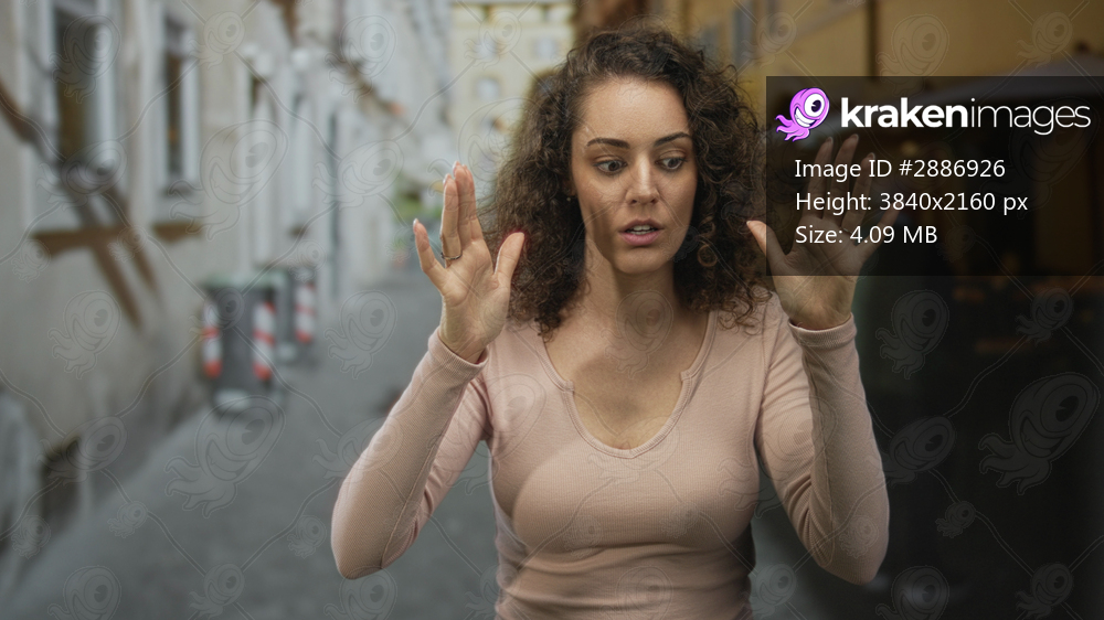 Woman with hands raised palms forward on a narrow cobblestone city street alley, wearing pink longsleeve shirt and rings, staring ahead; surprise.