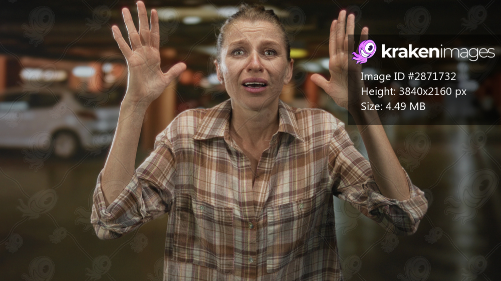 Woman with hands raised, palms open beside parked white car in underground parking building, distressed expression; panic pleading.