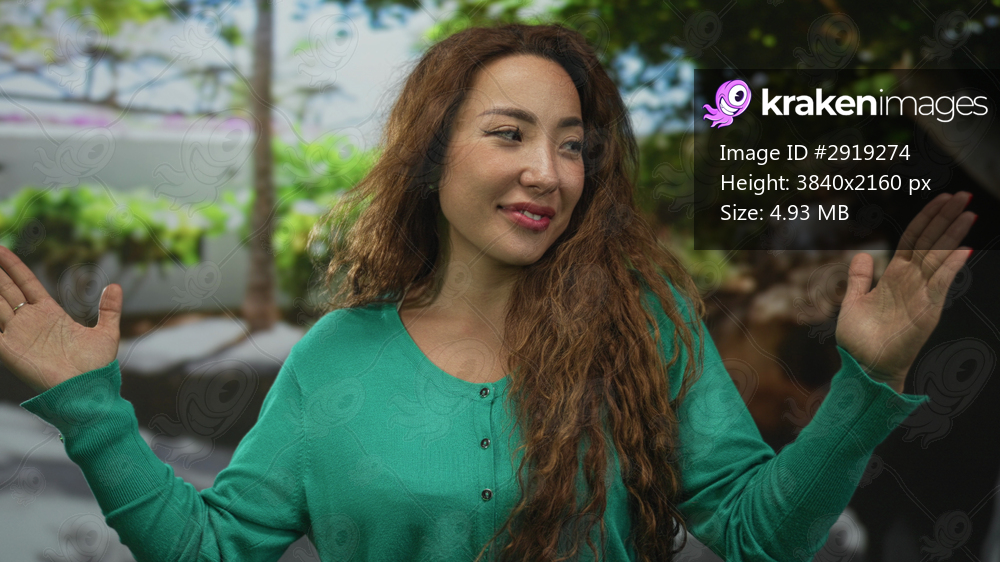 Woman with hands raised and palms open, wearing green cardigan and long wavy hair in forest setting; playful confidence.