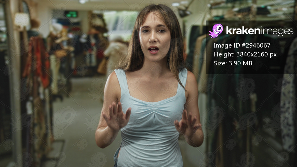 Woman with hands raised palms out in a clothing store building, walking aisle between racks; hesitation surprise.