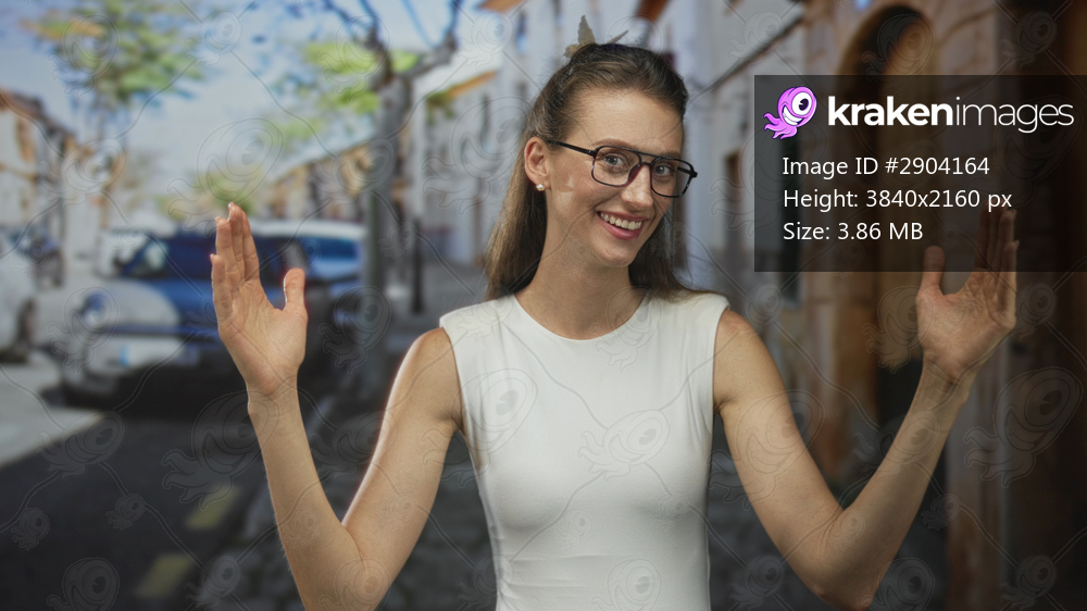 Woman with hands raised palms out on street beside parked car smiling with glasses and sleeveless top; quiet joy.