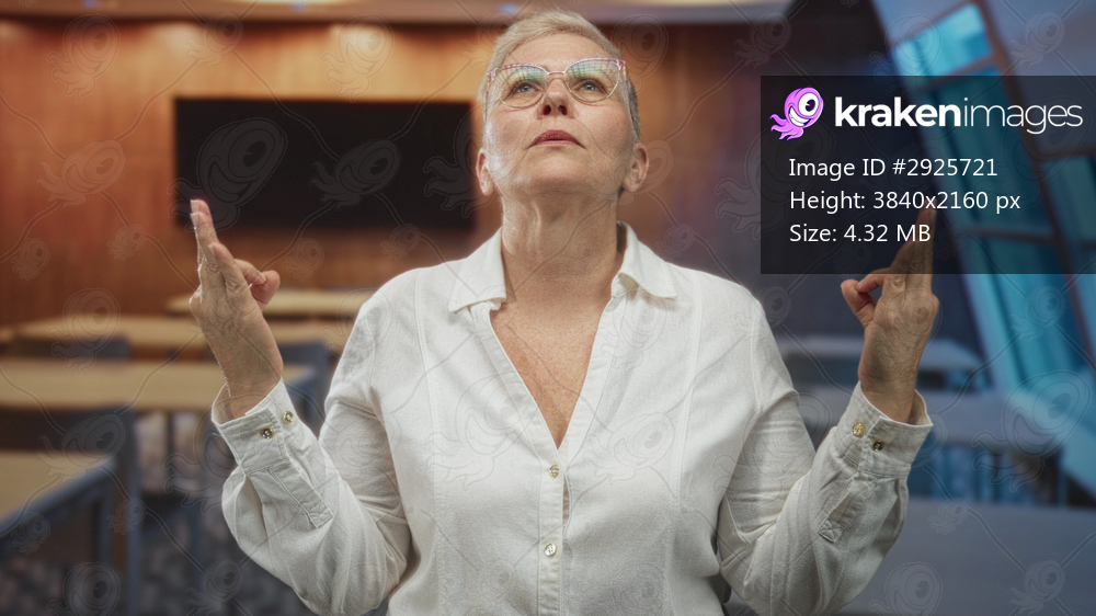 Woman with hands raised palms up in classroom building wearing white shirt and glasses, looking thoughtful; contemplation teaching patience.