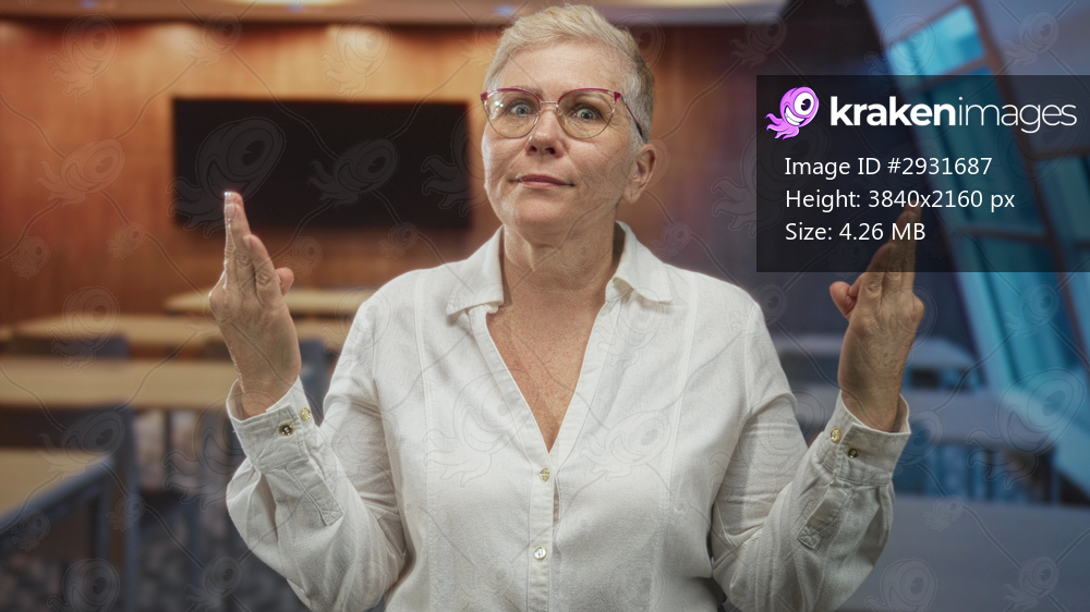 Woman with hands raised palms up in classroom building wearing white shirt and glasses, looking thoughtful; contemplation teaching patience.