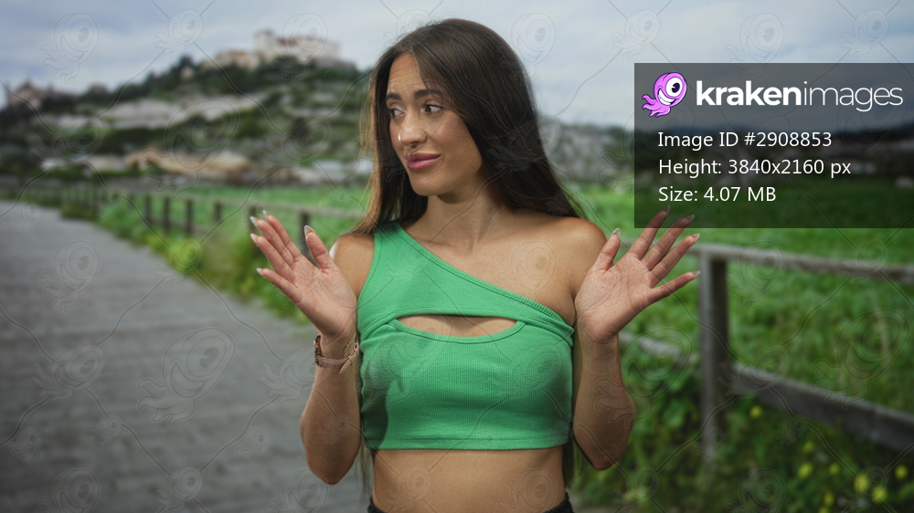 Woman with hands raised, palms visible on a street path in the countryside wearing a green crop top; surprise curiosity.