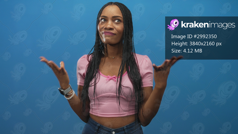 Woman with hands raised shrugging in studio wearing pink top and jeans with braids and smartwatch; confusion doubt.