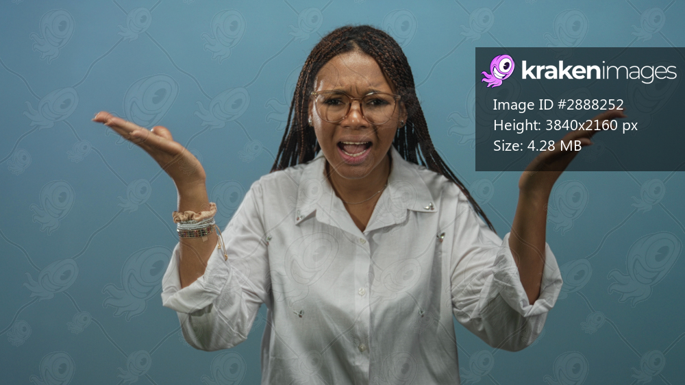 Woman with hands raised shrugging and open mouth in blue studio wearing glasses and white shirt; frustration.