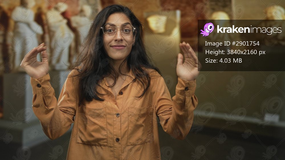 Woman with hands raised and smiling in museum gallery, wearing mustard shirt and glasses; curiosity joy.