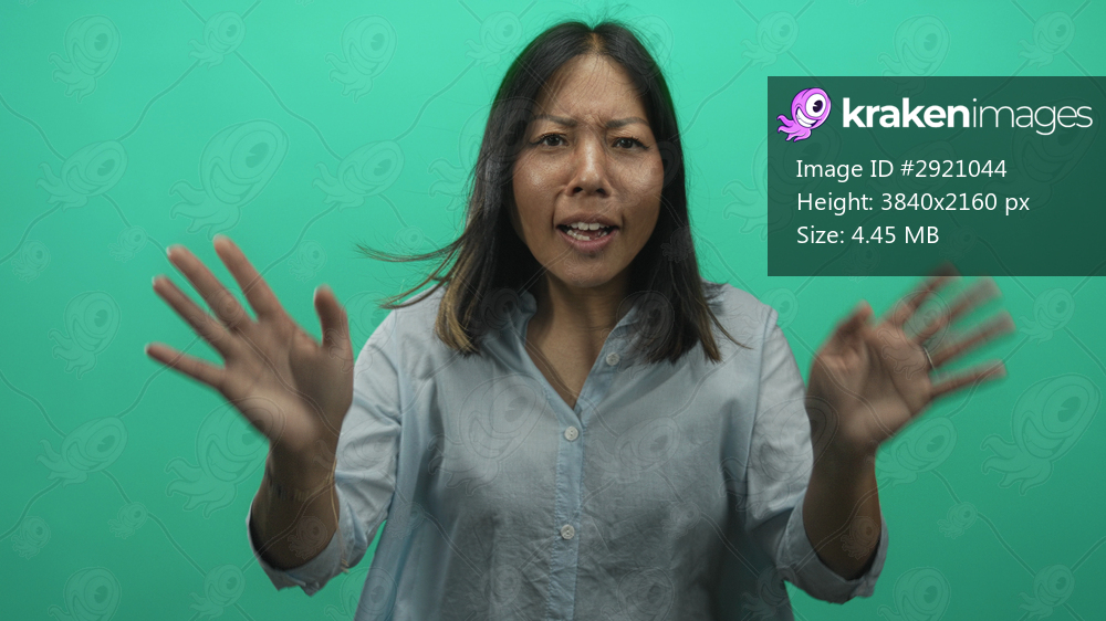 Woman with hands raised toward camera in studio with teal green backdrop; surprise friendly connection energy.