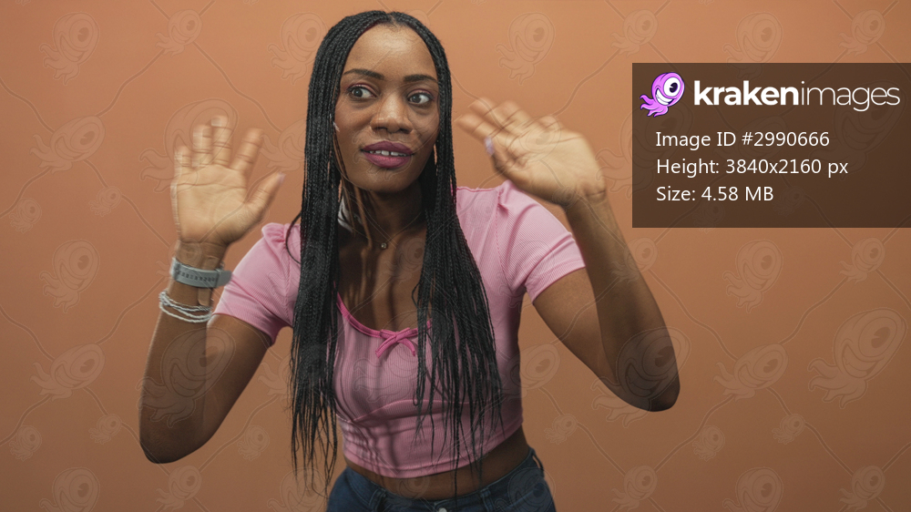 Woman with hands raised waving, wearing pink shirt and blue jeans, long braids, bracelets and smartwatch in studio; warm friendly greeting.