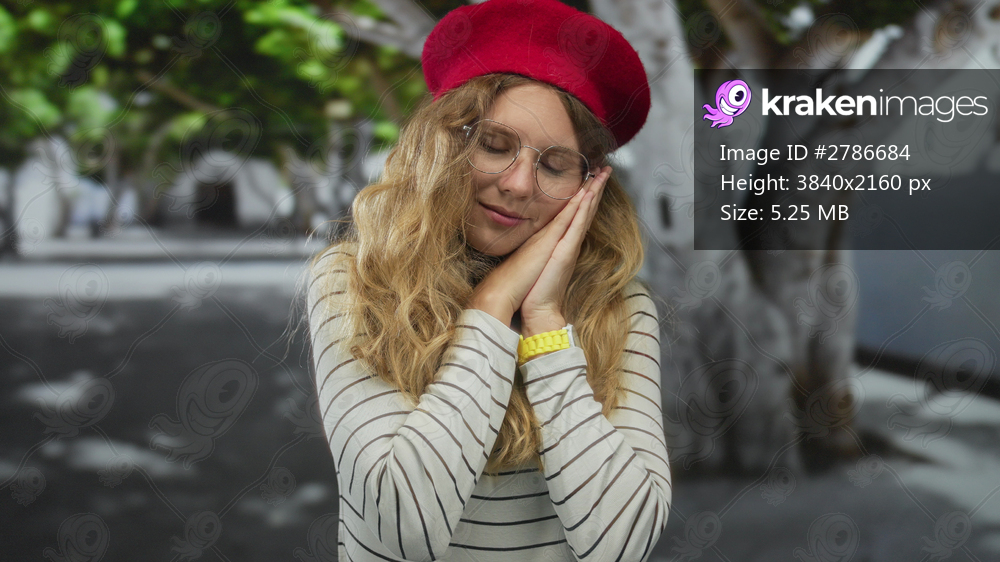 Woman with hands resting in a courtyard features blonde young hair under a red beret and glasses in a fashion portrait conveying a peaceful mood.