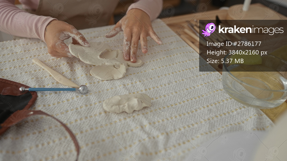 Woman hands shaping clay into heart forms on a wooden table with water bowl and clay tools in pottery studio; creativity focus.