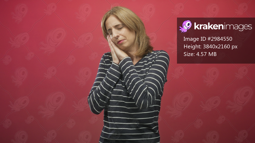Woman with hands to cheek and closed eyes making sleeping gesture, wearing striped shirt against red studio backdrop; tired rest sleepiness.