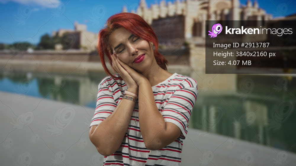 Woman with hands to cheek for sleep, eyes closed, red hair, striped shirt, standing by an old town stone building and canal; serenity.