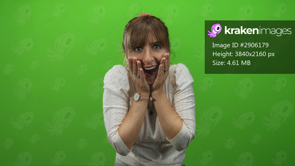 Woman with hands to cheeks, mouth open and wide eyes, rings and watch visible, wearing white blouse and necklace in green studio; surprise.