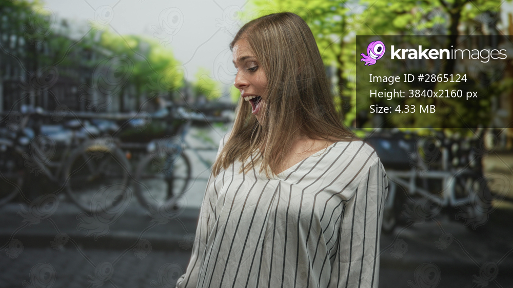 Woman hands to cheeks smiling on sunlit street in amsterdam canal area wearing striped blouse and watch; surprise travel moment.