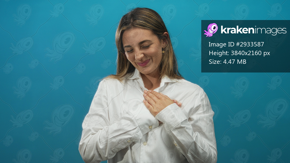 Woman with hands to chest in teal studio, smiling gently and offering a thankful gesture; gratitude sincerity.