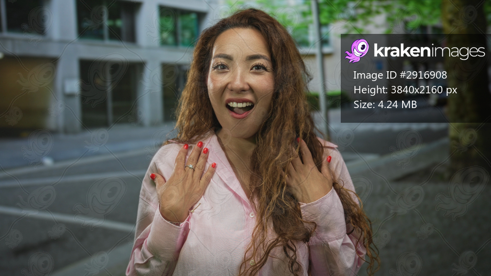 Woman with hands to chest and mouth open in surprise on a city street near building and tree, pink blouse and red nails; surprise reaction.