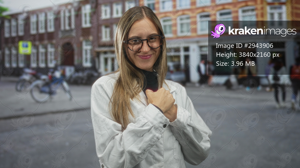 Woman with hands to chest on a street lined with brick buildings, smiling, wearing glasses and white jacket; gratitude kindness connection.