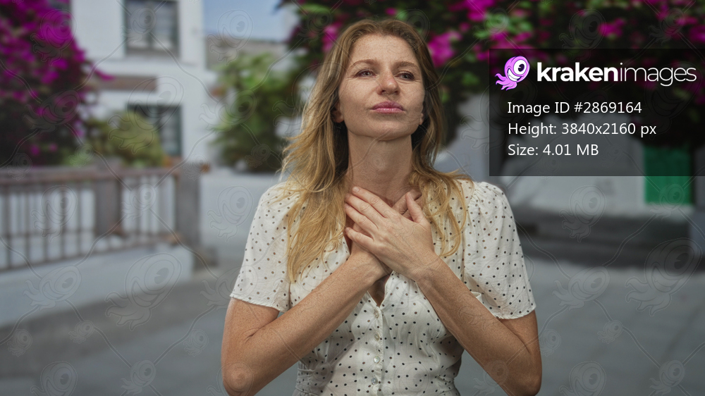 Woman with hands to chest standing on a street beside a white building and blooming bougainvillea; gratitude reflection.
