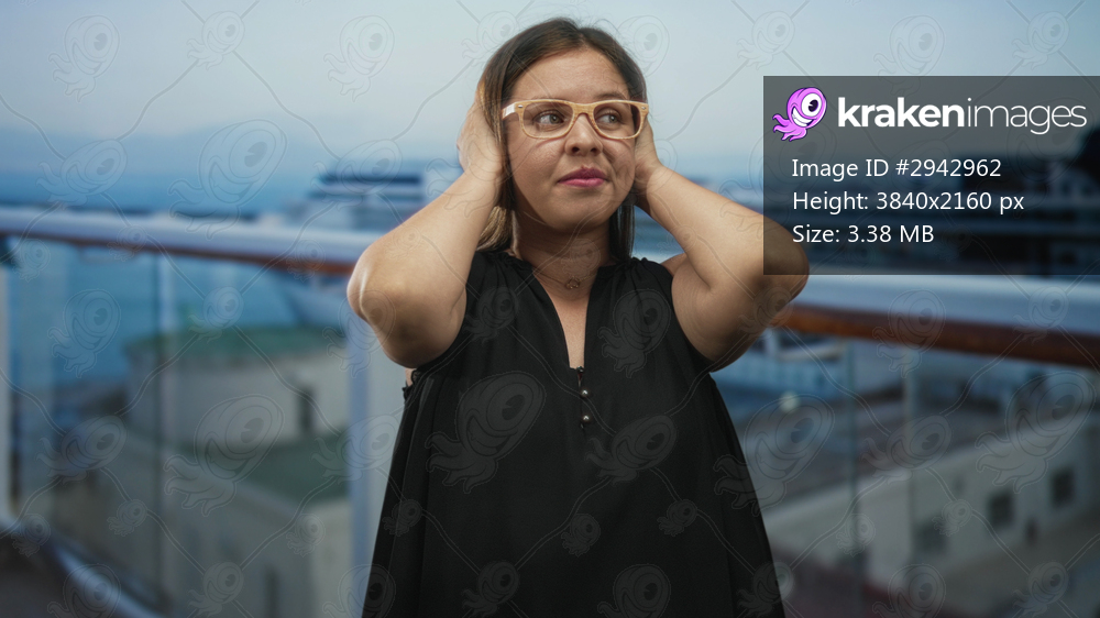 Woman with hands to ears on cruise ship deck wearing glasses and black dress looking upward; travel anxiety.