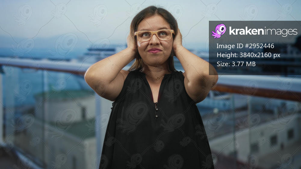 Woman with hands to ears on cruise ship deck wearing glasses and black dress looking upward; travel anxiety.