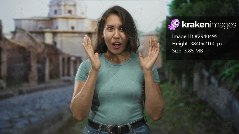 Woman with hands to face on a cobblestone street in an old town, smiling and surprised; surprise travel memory.