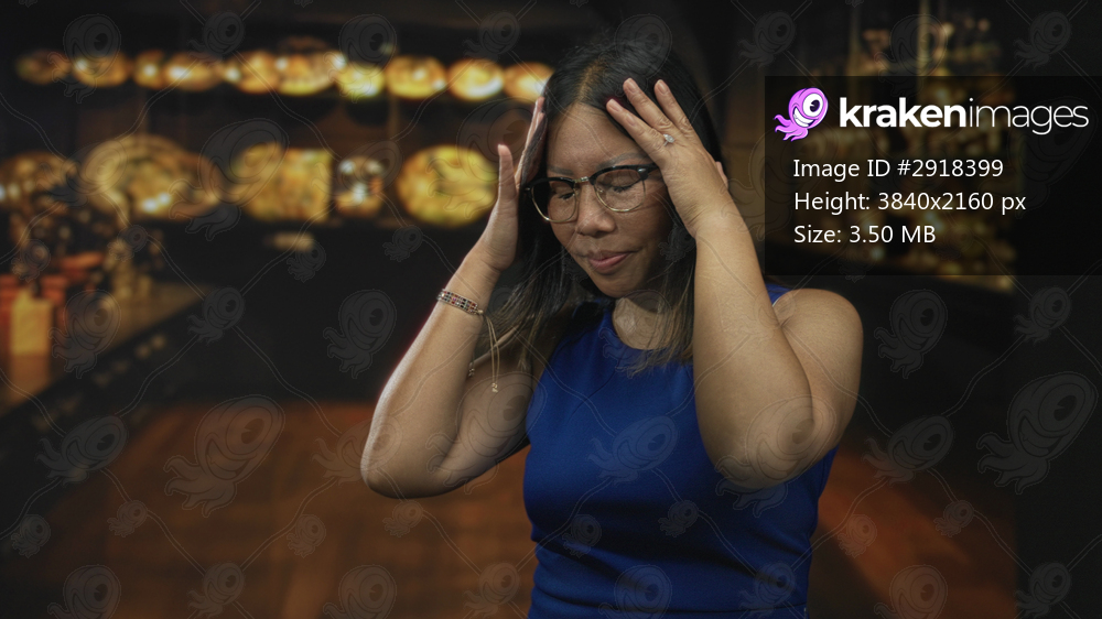 Woman with hands to head and eyes closed in a dim museum building, wearing blue dress and glasses; stress fatigue.