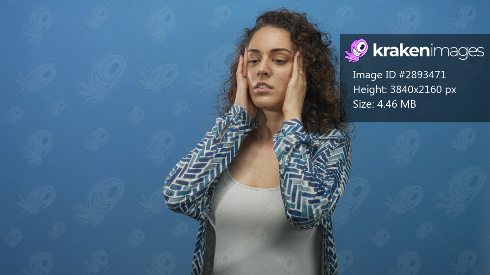 Woman with hands to temples and closed eyes in blue studio, patterned shirt and white tank top showing neck and upper chest; headache.