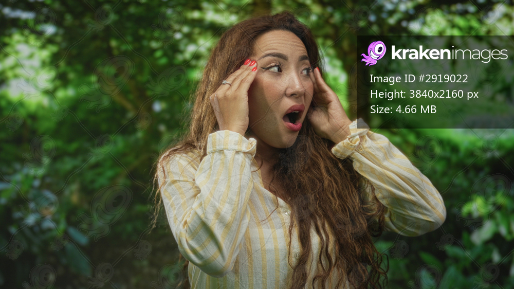Woman with hands to temples and open mouth in green park, palms raised beside head under trees; astonishment.