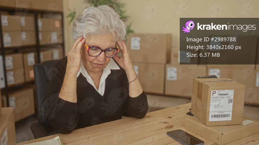 Woman with hands to temples over shipping boxes in small business building, sending packages at desk; stress perseverance.